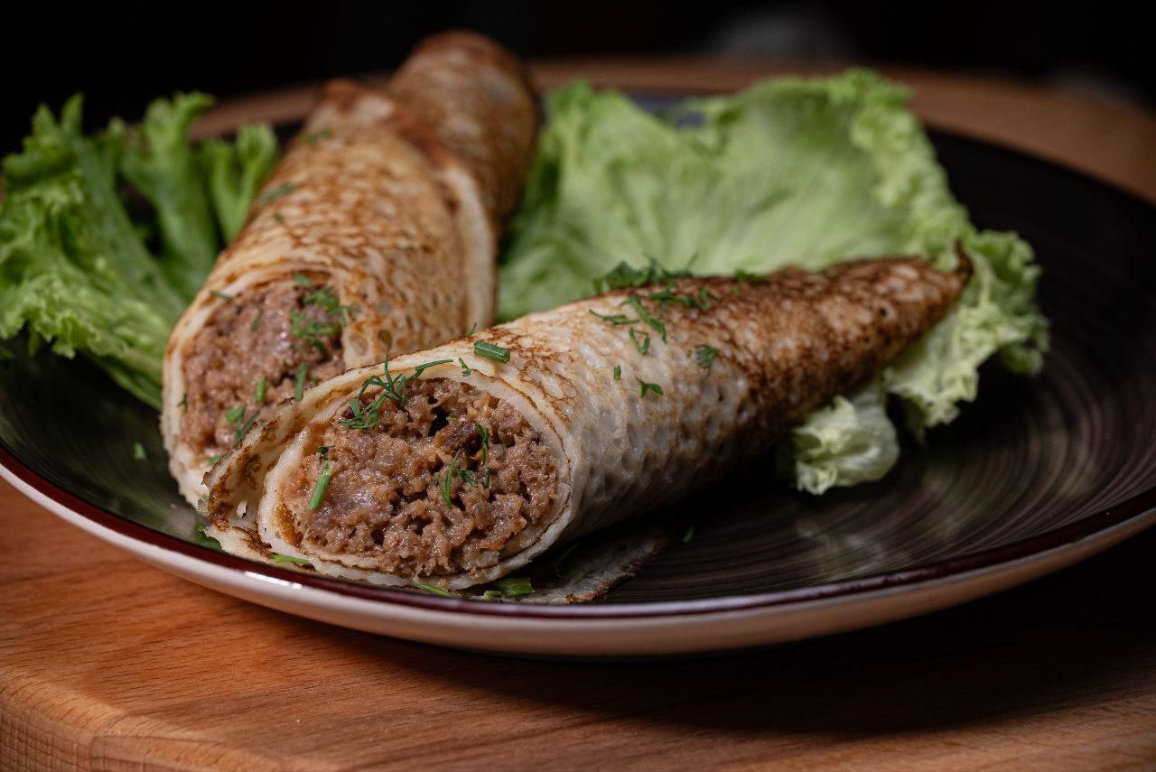 Тонкий блин с сочной мясной начинкой. Сытный вариант для завтрака или перекуса.