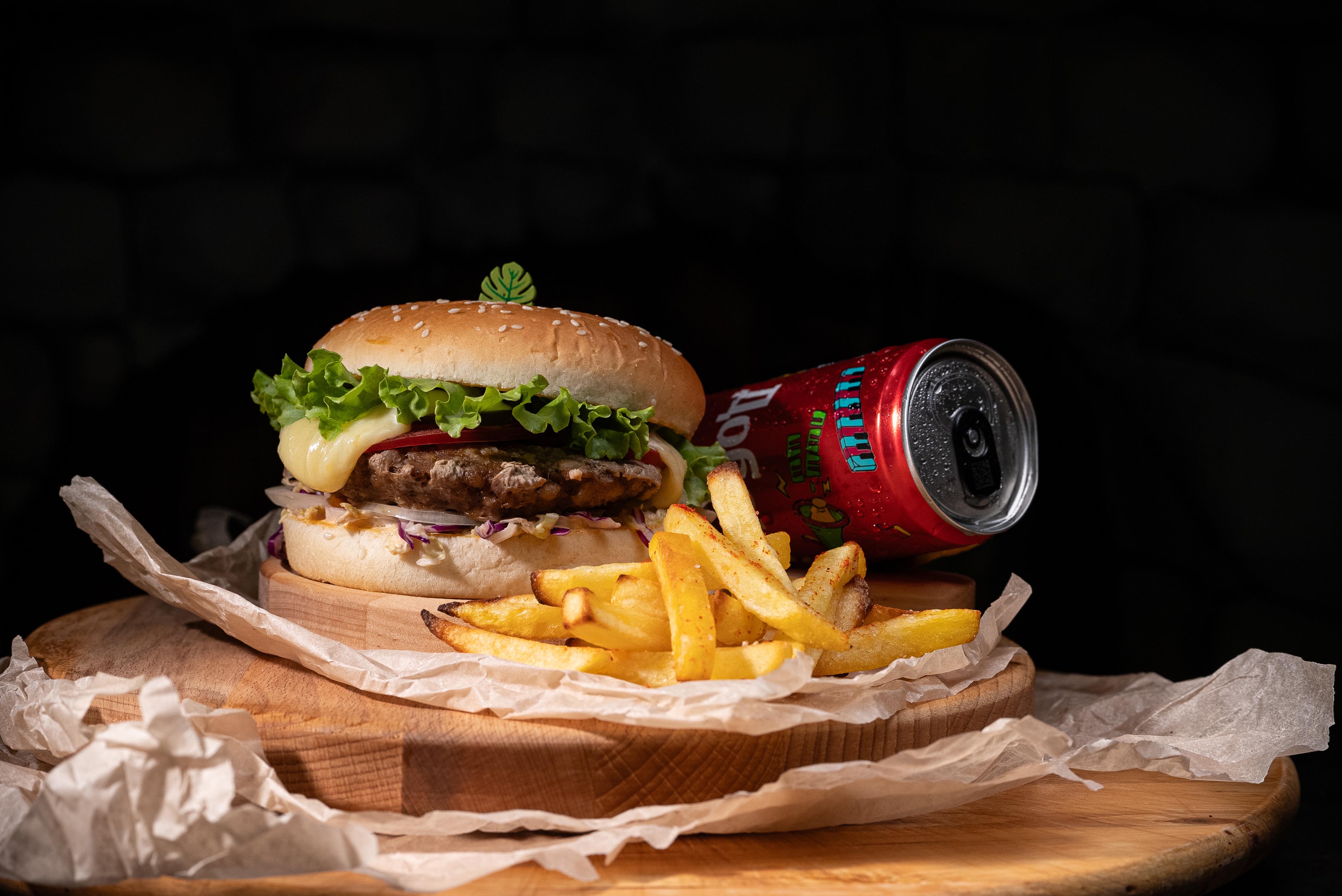Большой бургер с говяжьей котлетой, сыром моцарелла, маринованными овощами и листом салата. Белый соус придаёт мягкий вкус, а микс салата добавляет свежесть.