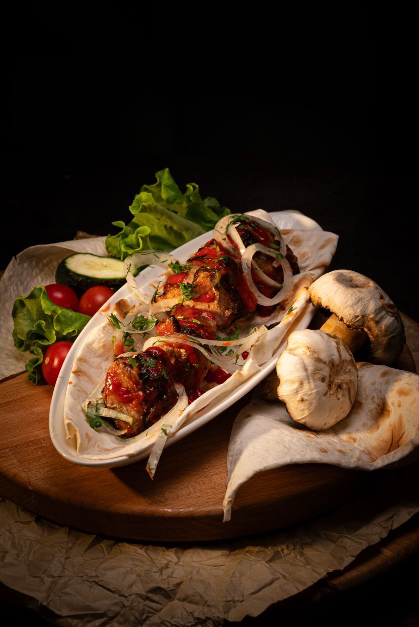 Гирос-гриль — сытное блюдо на компанию. В набор входят курица гриль, сырные треугольники, свежие овощи, картофель фри и три соуса.