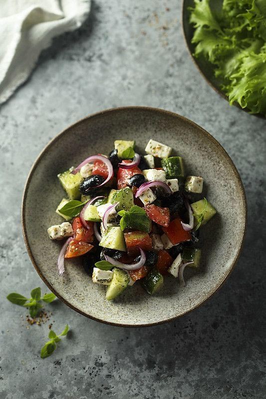 Овощной салат из огурцов, помидоров, сладкого перца и маслин с кубиками фетаксы. Заправлен греческой заправкой на основе оливкового масла.
