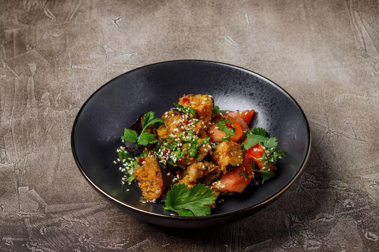 Обжаренные кусочки баклажана с помидором, кинзой и кунжутом. Заправлен оливковым маслом, подаётся охлаждённым.
