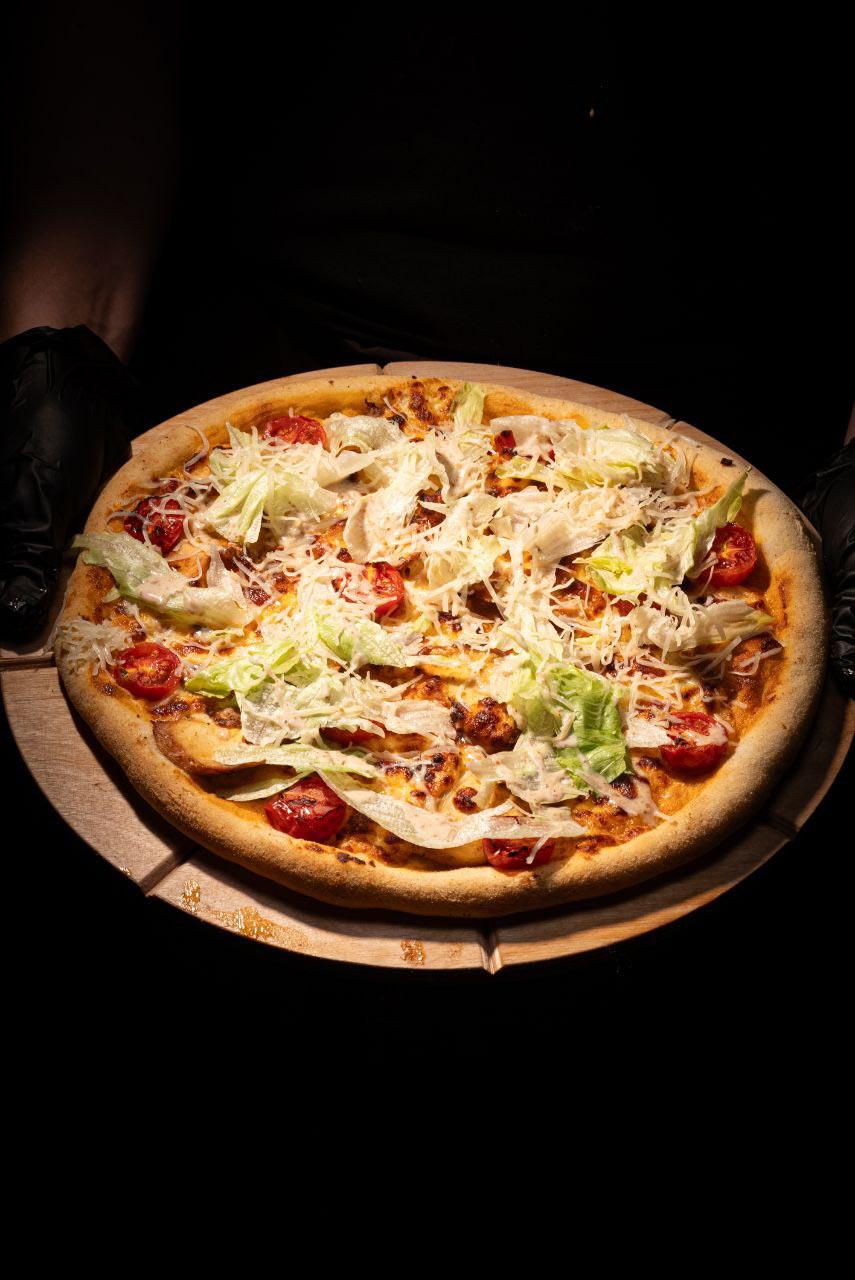 Оригинальная пицца с курицей, соусом Цезарь, томатами черри, пармезаном и салатным миксом. Легкая и ароматная.