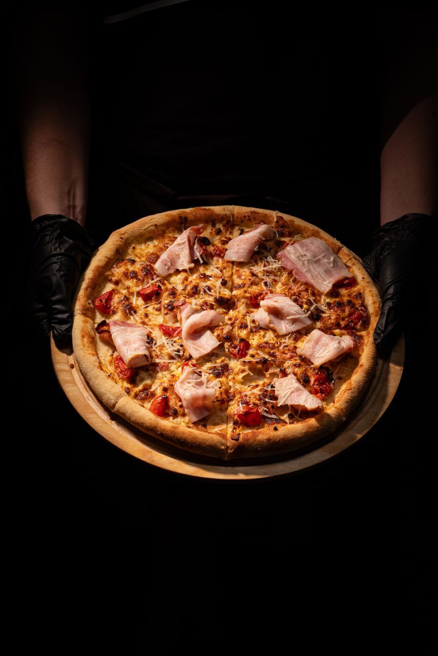Классическая комбинация ветчины, шампиньонов и сыра моцарелла на тонком тесте. Простая и вкусная.
