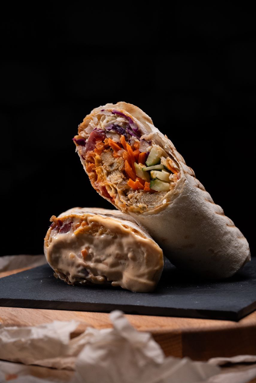 Лаваш с кусочками курицы, салатом, огурцом, помидором, луком и морковью по-корейски. Белый соус делает вкус мягким и сбалансированным.