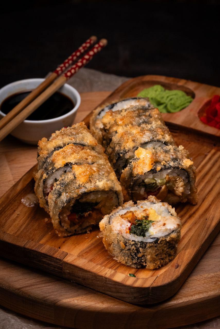 В составе нори, рис, лист салата, огурец, помидор, соус цезарь, курица, имбирь, васаби, соевый соус.