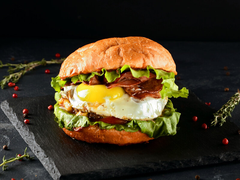Плавленый сыр, жареное яйцо, ломтики помидора и белый соус в мягкой булке. Подходит для быстрого завтрака и перекуса.